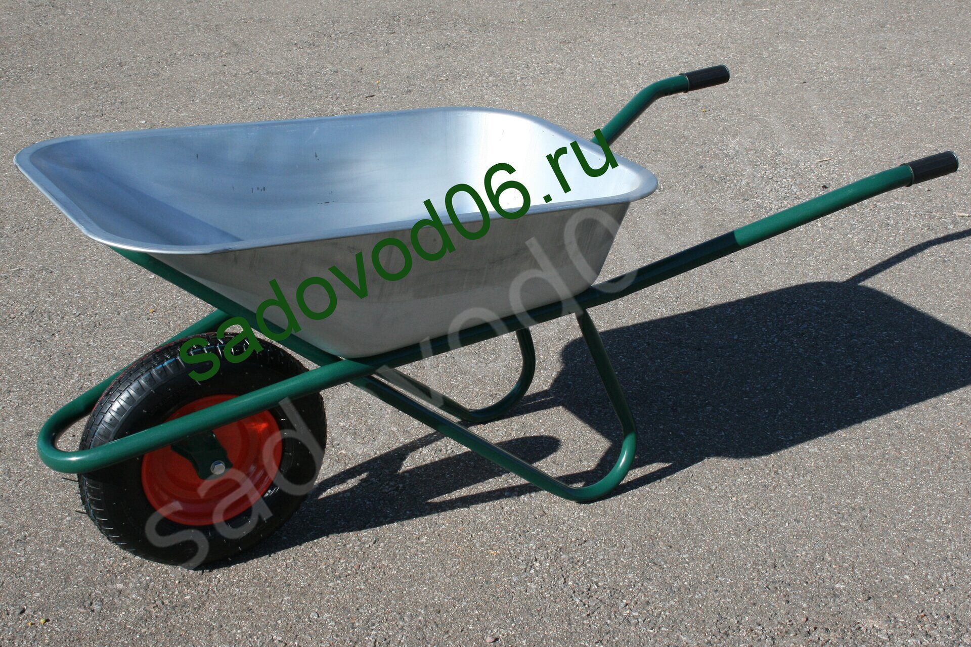 Тачка строительная одноколесная, кузов оцинкованный, рама и опора окрашены полимерным антикоррозийным покрытием темно-зеленого цвета, колесо 400.8 со стальным сварным неразборным диском.